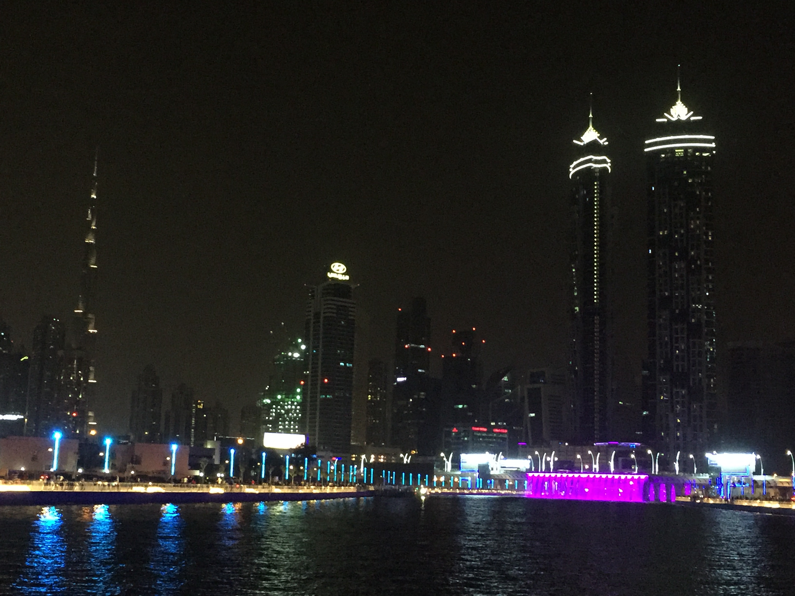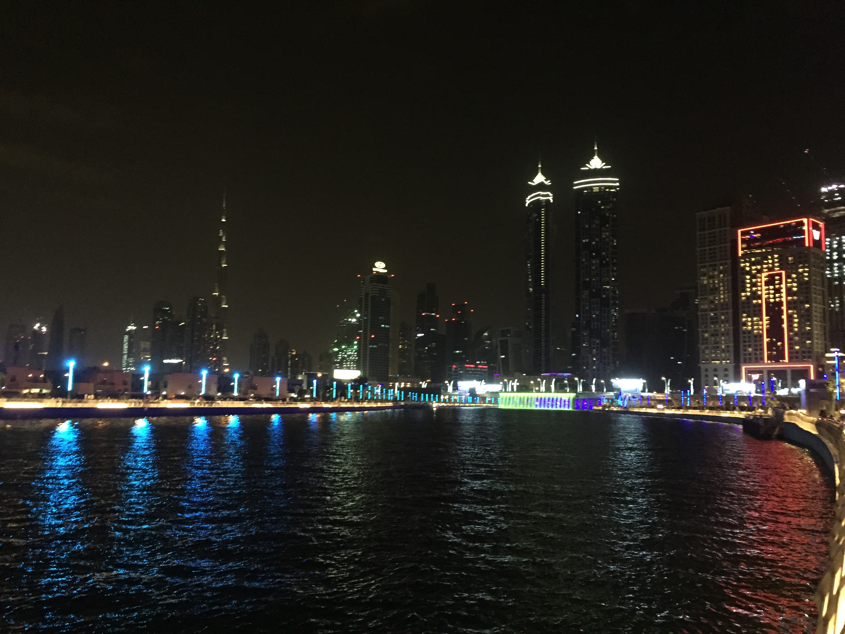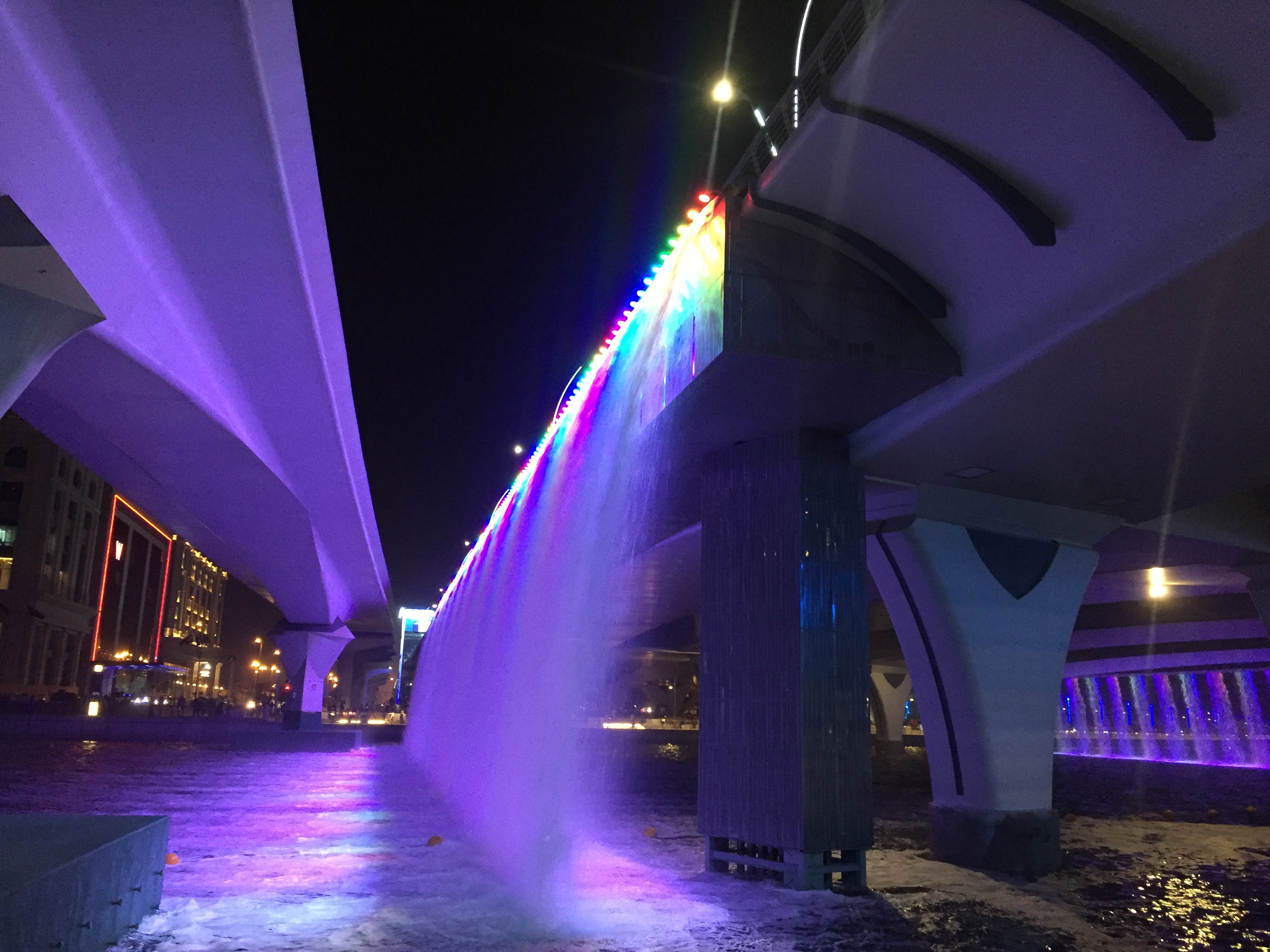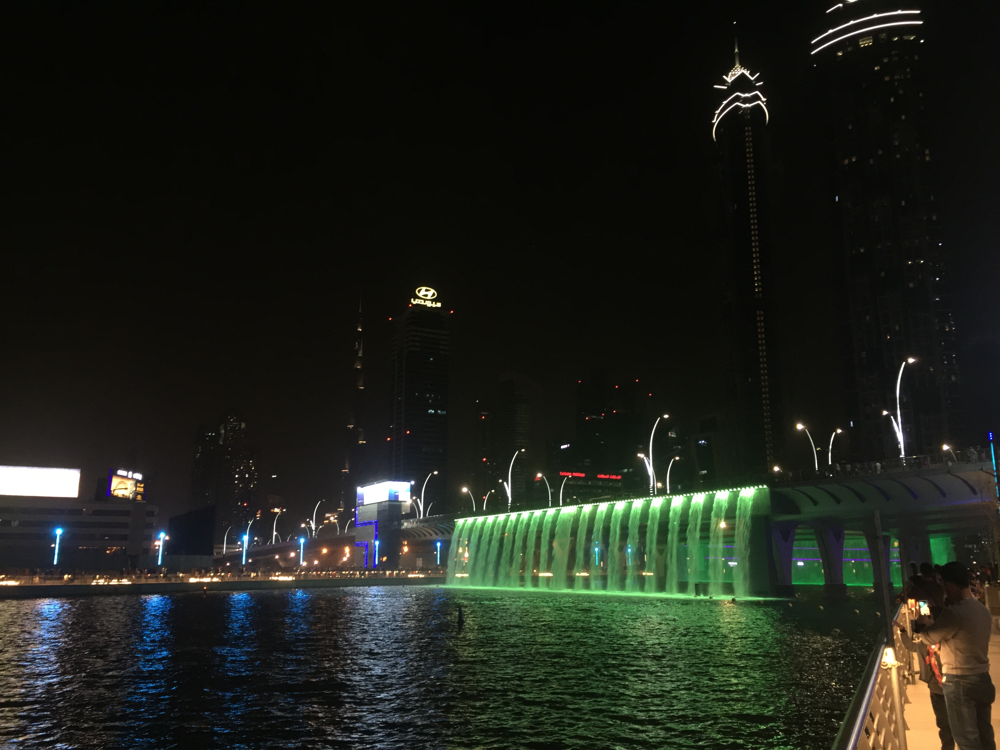 It was Friday evening and we noticed that there were many others along side us including folks in groups who were walking towards Dubai water canal. We noticed the spectacular waterfall and bright color lights